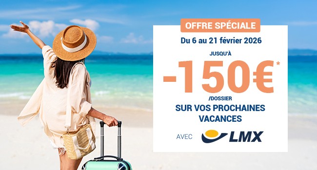 *Jusqu’à -150€ par dossier pour toute réservation d’un voyage LMX du 06/02 au 21/02/2026 inclus. -50€ de remise par dossier à partir de 2000€, -100€ de remise par dossier à partir de 3000€, -150€ de remise par dossier à partir de 5000€. Voir conditions détaillées en agences.